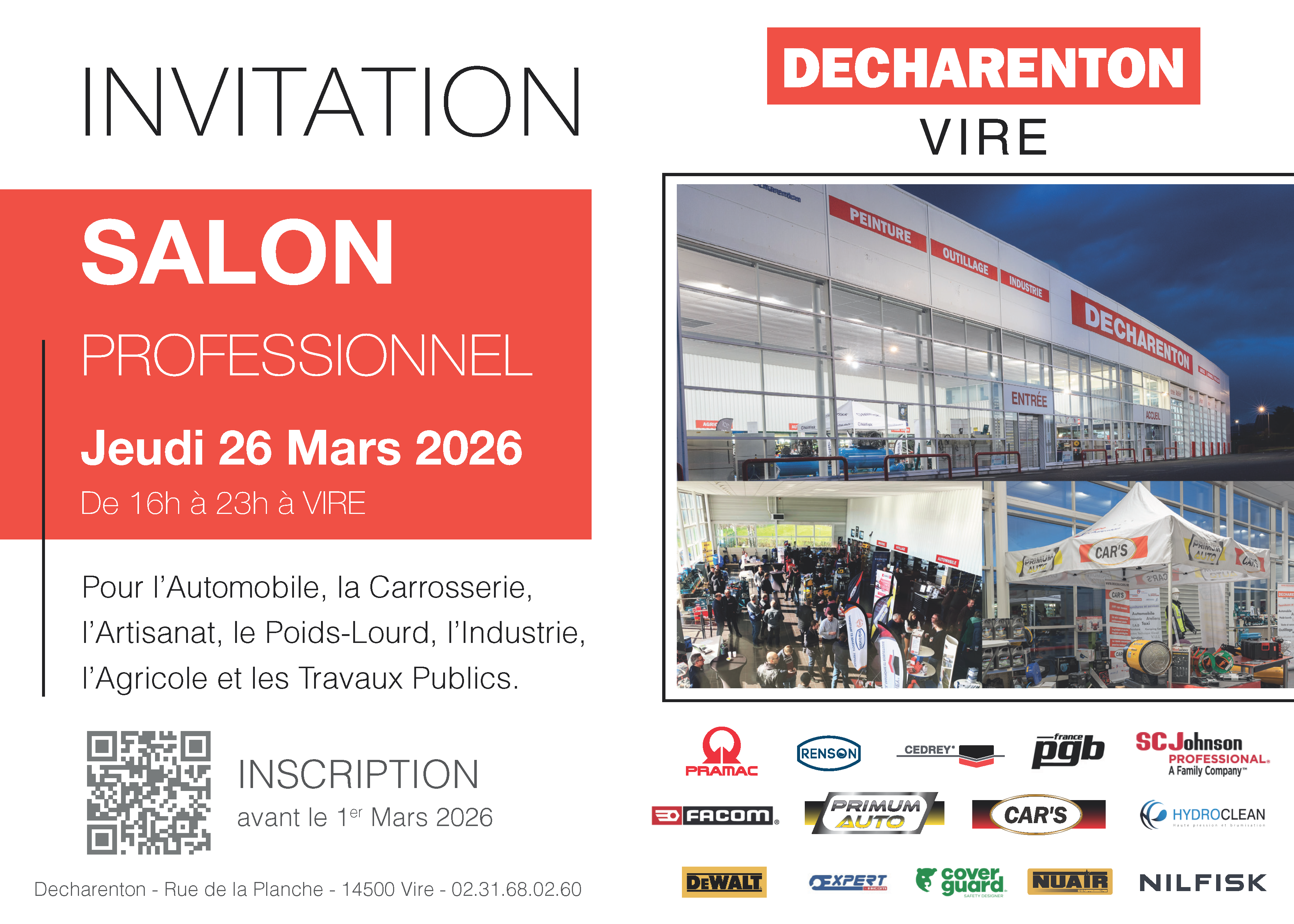 Le Jeudi 26 mars 2026, Decharenton vous donne rendez-vous dans son établissement de Vire pour une soirée dédiée aux professionnels. Cet événement rassemblera fournisseurs et acteurs des secteurs Automobile, Poids Lourd, Agricole et Industrie.
